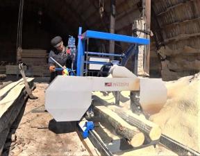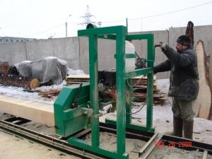 Пилорама состоит из пильной каретки, которая движется вдоль бревна, неподвижно закреплённого на рельсовом пути.